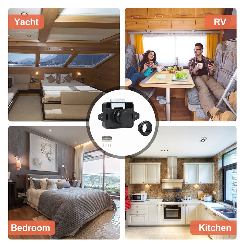 - Package list: RV furniture lock with 4 x screws and 1 x safety plate.