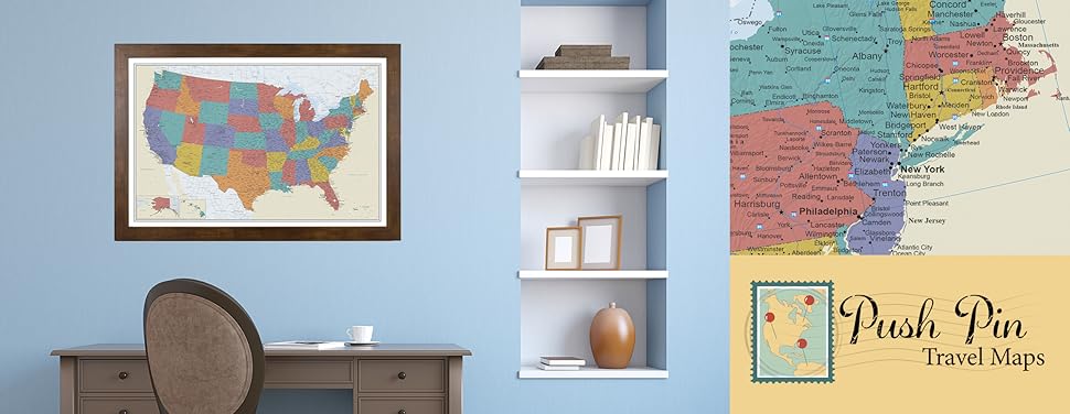 All of our maps are handmade right here in the USA and we take great pride in each and every map we produce. The process starts by professionally dry mounting the map to a sturdy foamcore board. The map is then framed in the stylish 2" frame of your choice. We then install the wire hanging kit on the back so your map will arrive ready to hang right out of the box. Every map is checked three times for perfection before being packaged up and shipped to you. We even include the nail and hanger, so no extra trips to the store are required. Simply hang your map and start pinning away while reminiscing about your favorite vacation memories!