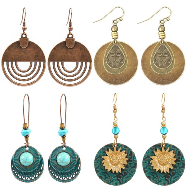 - Boho Earring Set: These ethnic earrings feature a beautiful design that blends bohemian aesthetics with fashion trends. We adopt sunflower, flower, turquoise, round disc, tribal, and teardrop designs, these features and artistic details make them standout jewelry