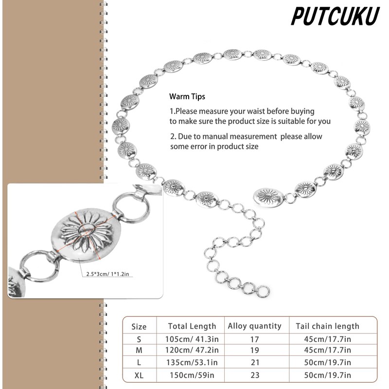 - Size: Choose from 4 lengths: (S) 41.3" - Fits waist up to 31 inches, (M) 47.2" - Fits waist up to 38 inches, (L) 53.1" - Fits waist up to 46 inches. and (XL) 59" - Fits waist up to 53 inches,The chain belt size provided is for reference purposes only. You can choose the length of the chain belt based on your preference for the extension chain size