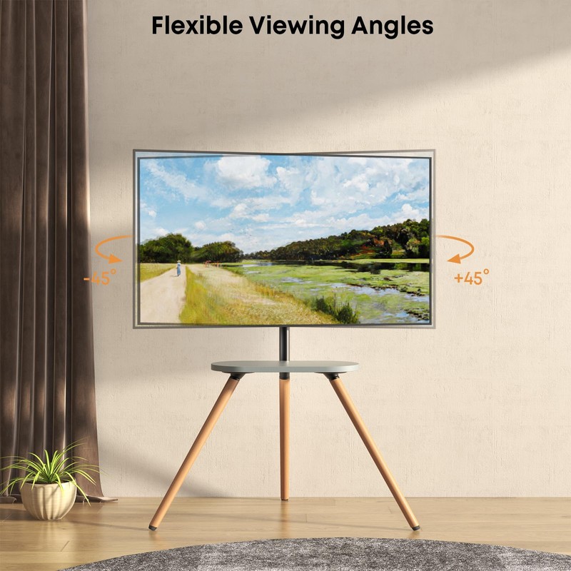 • Patented Easel Design: This tripod TV stand features a unique, artistic easel-inspired design that transforms your flat-screen TV into a stylish centerpiece. Perfect for living rooms, bedrooms, studios, offices, and corners, it adds a modern touch to any space