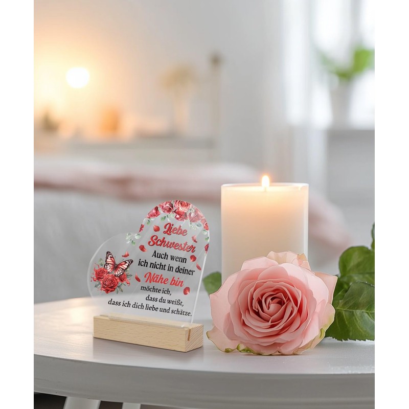 Putuo Decor Herzform Acryl Tischdeko Schild für Schwester – Auch wenn ich Nicht in deiner Nähe Bin, Geschenk mit Rosen und Schmetterling