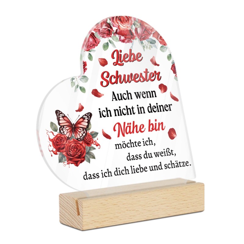Ein gefühlvolles Herz-Acrylschild mit Rosenmotiv und liebevoller Botschaft – das perfekte Geschenk, um deiner Schwester zu zeigen, wie sehr du sie trotz Entfernung liebst