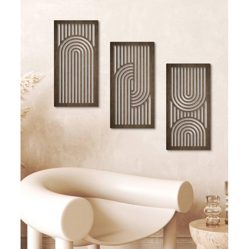 - Set of three wooden panels featuring symmetrical arched line patterns for a modern visual effect