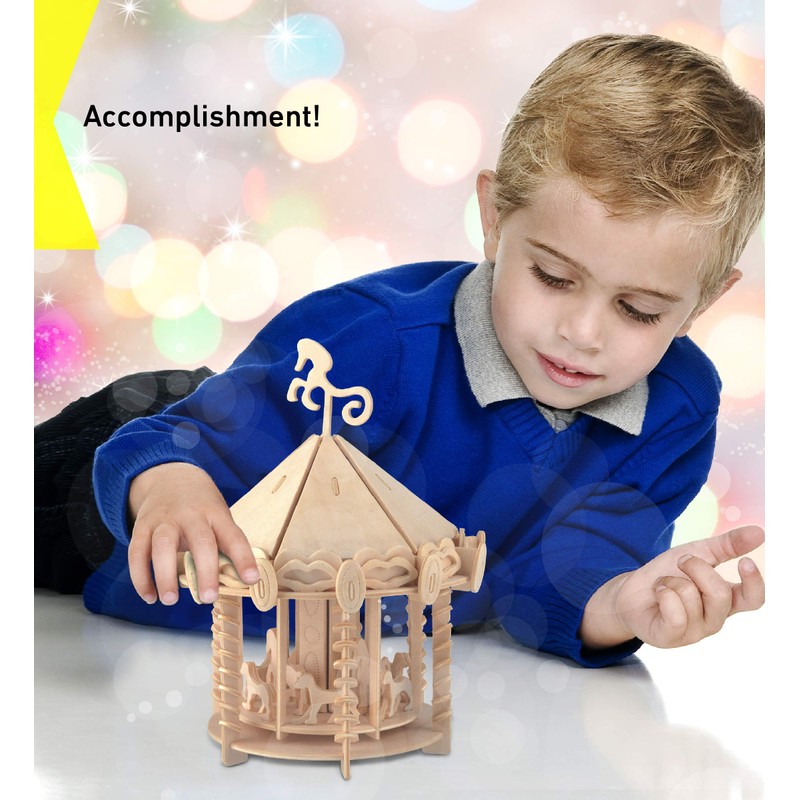 - COMPLETE SET, COMPLETE KIT. This Carousel Wood Craft Construction Kit contains 148 interlocking wooden pieces that are pre-cut. No need for scissors or cutters. A sand paper may be used for a smoother look. An instruction guide is provided in the box.