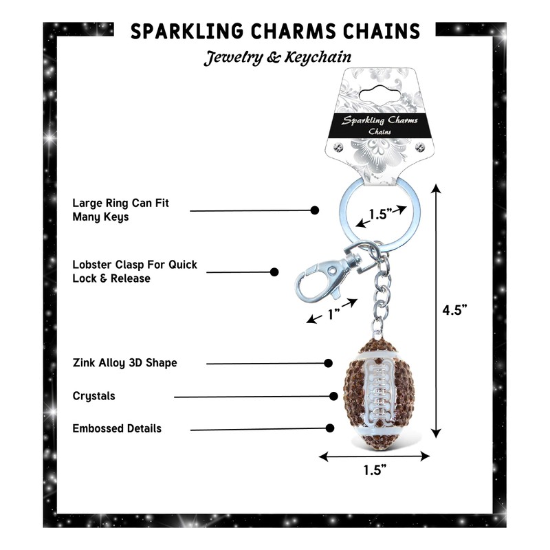 - INCLUDED WITH YOUR PURCHASE OF EYE-CATCHING Football Elegant KEY CHARM: Includes 1 Silver Football Elegant Keychain Charm with crystals, 2" long & includes lobster clasp for quick & easy attaching to your favorite bags, purses, handbags, key chains, lanyards & more. The key ring design is ready for adding many keys or more charms to it with style. The football shaped trendy design is covered with clear crystals over silver zinc alloy for maximum rhinestone bling that will stand out of the crowd.