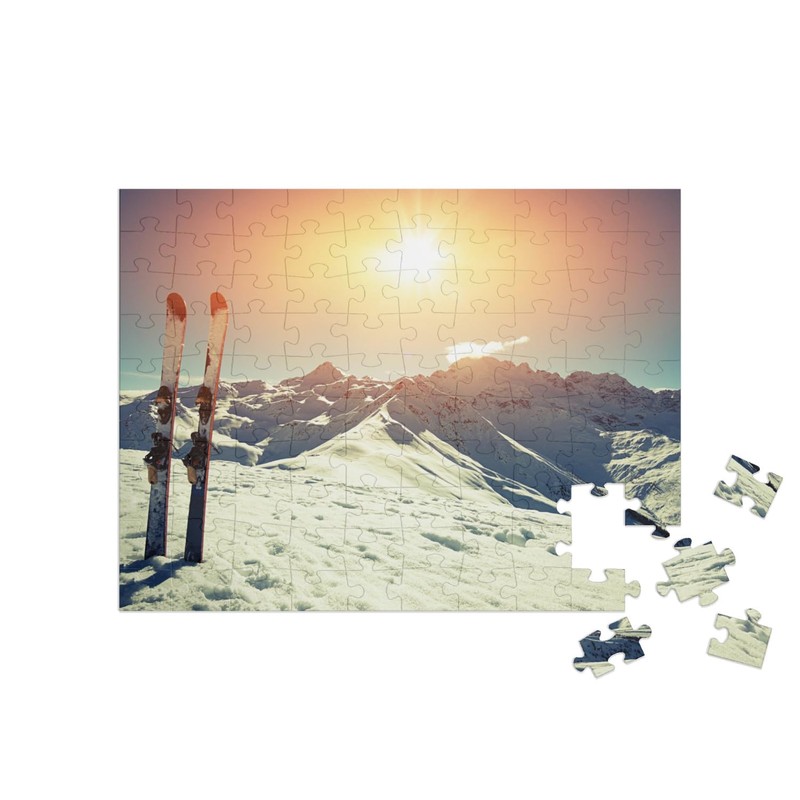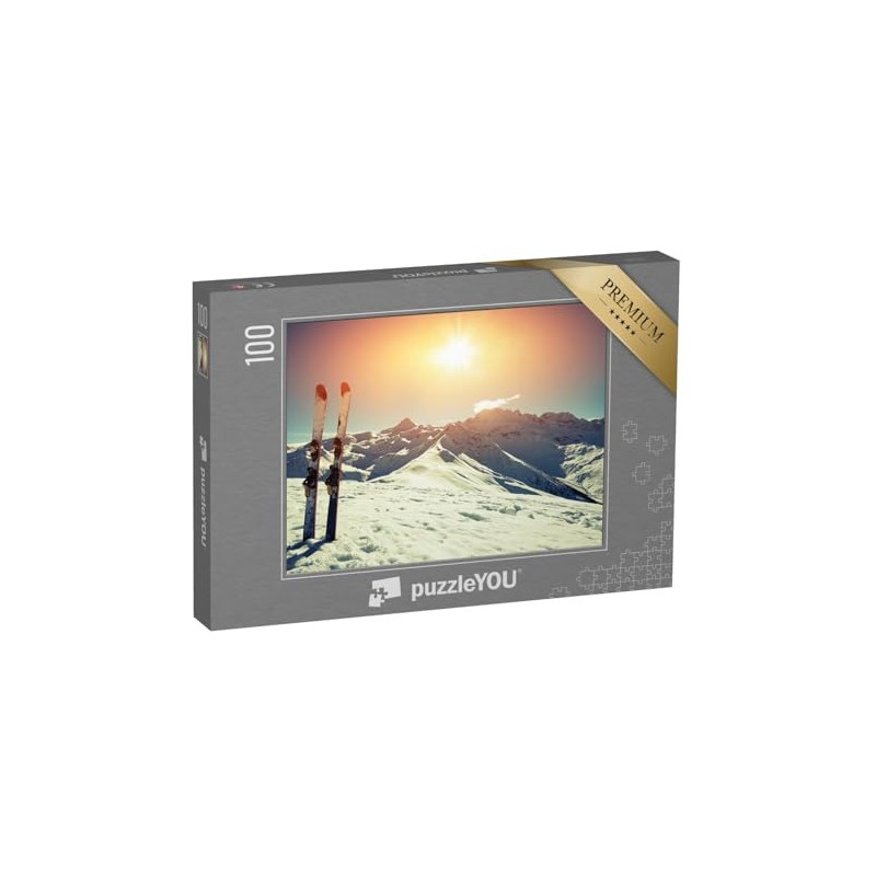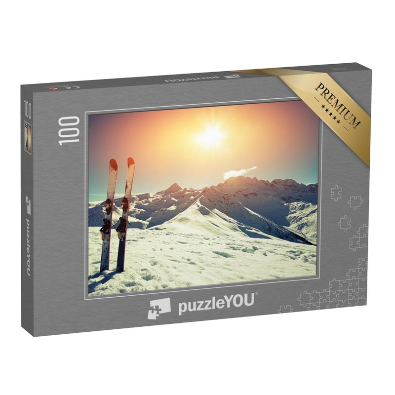 puzzleYOU: 100 Piece Puzzle "Skis in the Snow in the Mountains" - from the Sun, Sports, Winter, Sky & Seasons Puzzle Collection