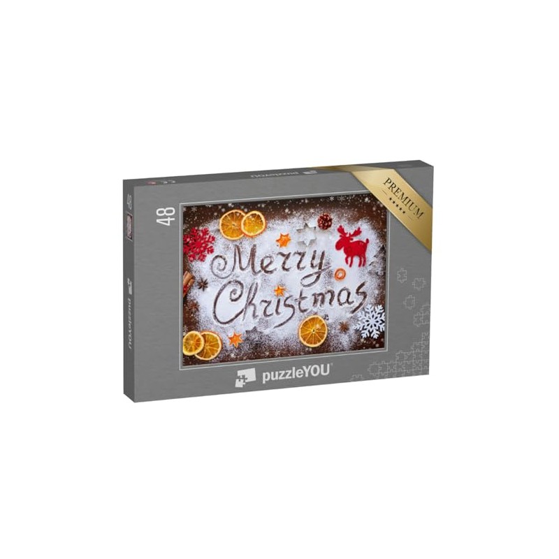 puzzleYOU: Jigsaw Puzzle 48 Piece Merry Christmas: Text from Flour with Decorations - From the Christmas Puzzle Collection