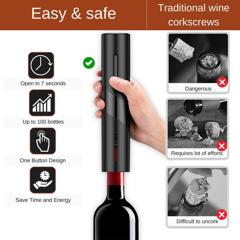 - EASY-OPERATION : Electric wine opener opens bottles in seconds by simply push a button. It could be applied to both synthetic and natural cork. No worries of pulling, twisting, or breaking the cork in pieces. Additionally, an electric wine opener is an excellent choice for individuals who are injured or have mobility issues.