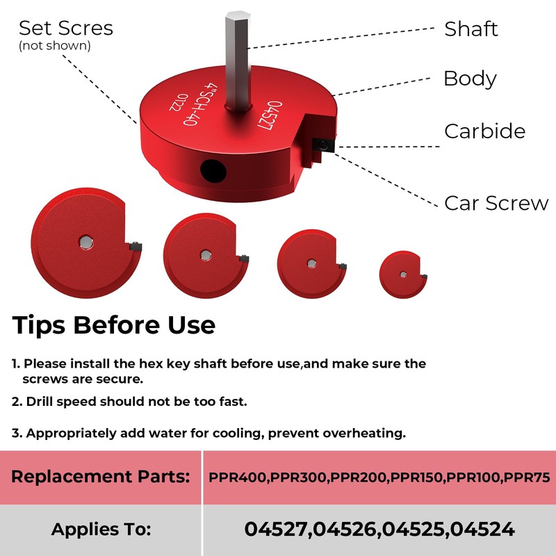 - Kind Tips --- The hex key shaft design can be compatible with standard drills, cordless drills, or impact drills.It is recommended to use a variable-speed electric drill with low-speed cutting; Check if the hex key shaft is locked or not before use; Appropriately add water for cooling to prevent the pipeline from melting at high temperature.