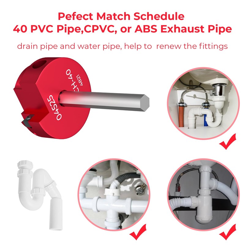 - Save Labor --- The PVC fitting saver is easily to clean the residual pipes and solvent cement residues on PVC, CPVC or ABS fittings,reduce labor time and materials costs. You can insert the PVC pipe reamer into broken pipe, ensure tool remains center, then ream the broken pipe until the depth you need.
