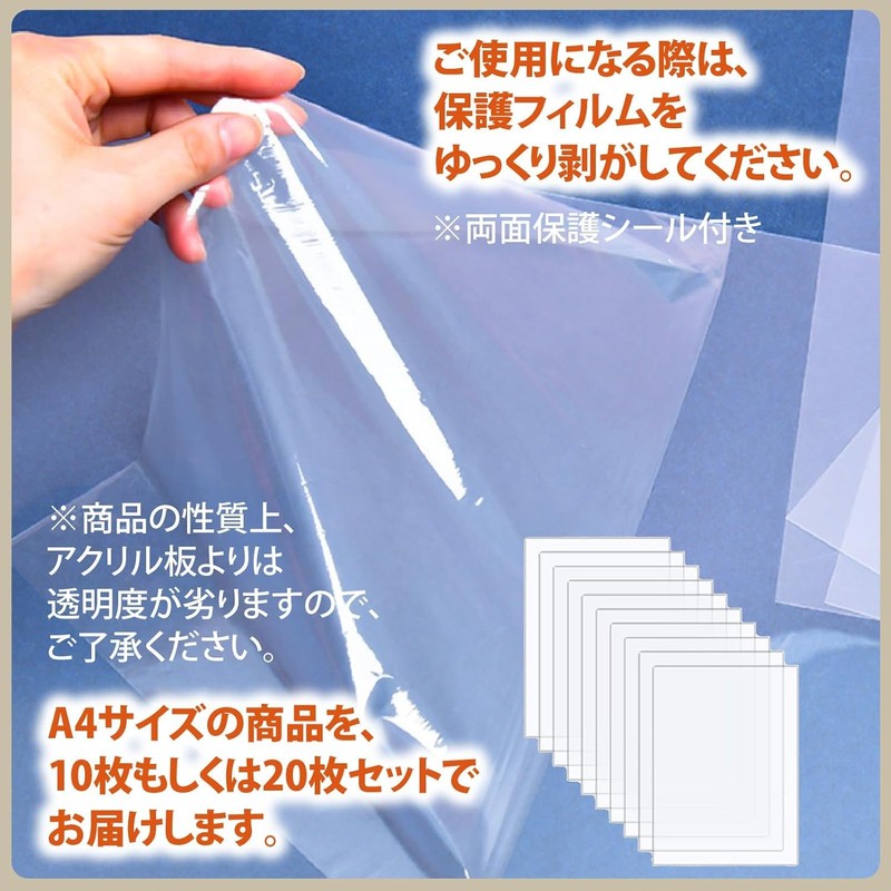 You will receive A4 size items in sets of 10 or 20. Choose the number of sheets you like. Please gently peel off the protective film when using it. You can enjoy the right amount of transparency.
