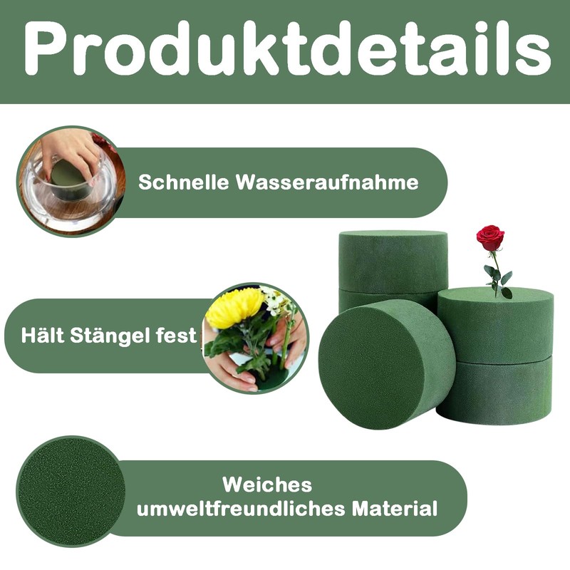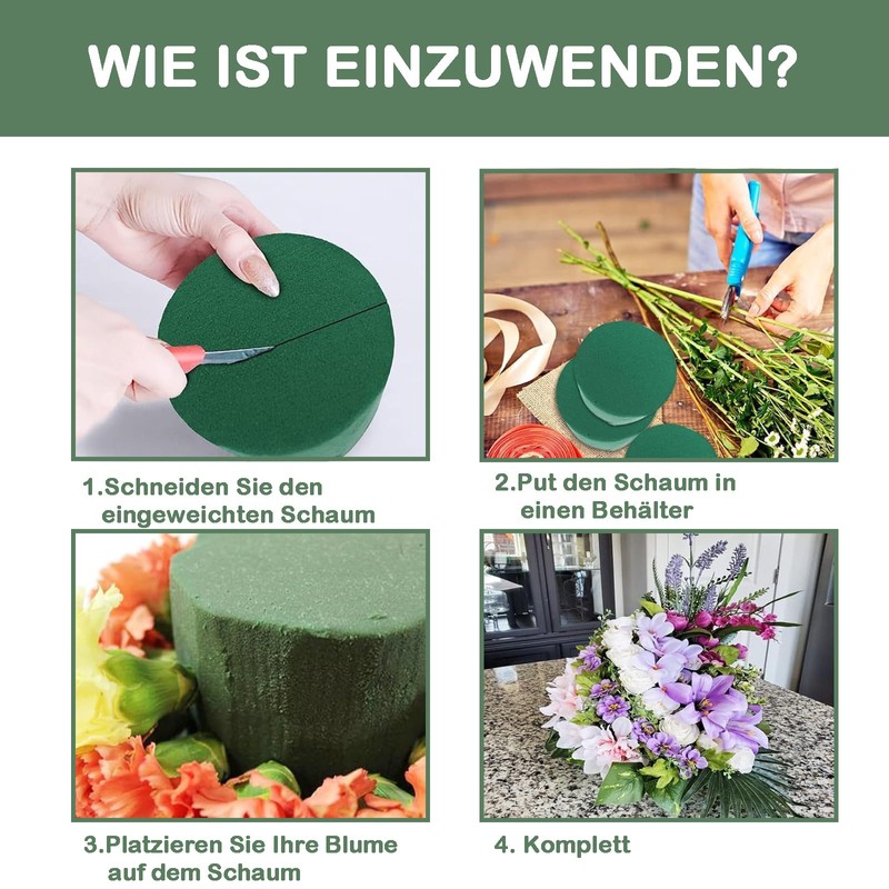 Easy to use: our flower foam can be used for both dry and fresh flowers. The round flower foam is easy to cut and shape. Molding compound for fresh flowers. You can easily adjust the shape of the foam to your flower arrangements and effortlessly insert it into any container. which makes it perfect for creating different flower arrangements.