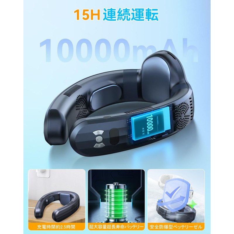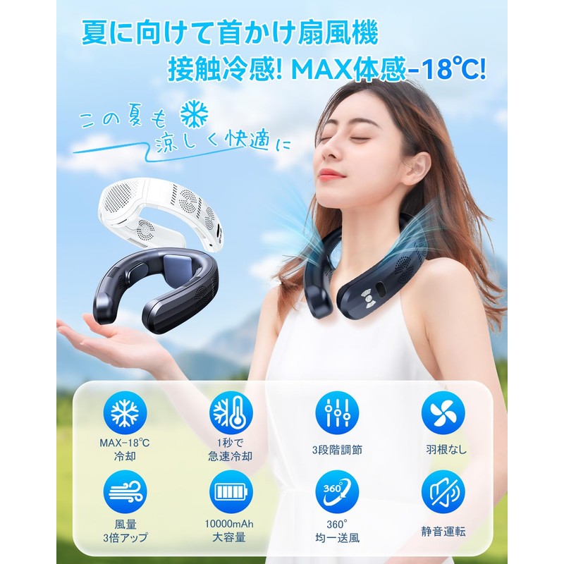 Stay comfortable in hot weather with this innovative neck cooler from 2025 summer. Uses Peltier elements for ice cooling in just 1 second. With 3 levels of air flow adjustment and cooling/heating function, it can be used in any season. High capacity 10,000 mAh battery allows you to use it for a long time, and also supports Type-C charging. The silent design allows you to use it in a variety of situations such as office, commuting to work or sports. Includes cooling plate for effective temperature adjustment. The lightweight design reduces the burden on the neck, making it the perfect countermeasure for heatstroke. Recommended for everyday use, as well as for Father's Day, Mother's Day, and birthdays. A convenient item to support comfortable temperature control at home, office or on the go.