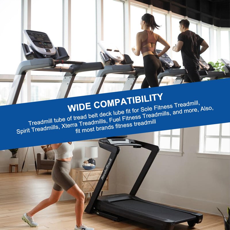 - WIDE COMPATIBILITY:Treadmill tube of tread belt deck lube fit for Sole Fitness Treadmill, Spirit Treadmills, Xterra Treadmills, Fuel Fitness Treadmills, and more, Also, fit most brands fitness treadmill, has the characteristics of good lubricity, high temperature resistance, stability and low volatility,product comes in easy to squeeze tube