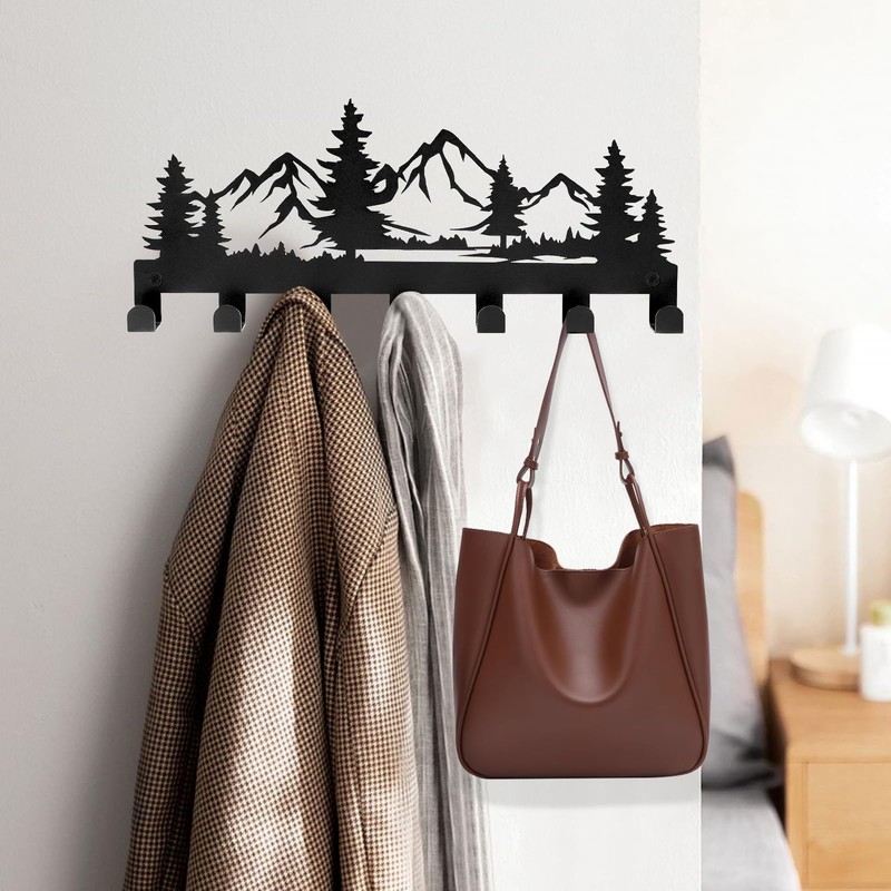 PWGHWG Key Holder for Wall Metal Key Holder Wall Key Hook Black Key Rack with 7 Hooks for Entrance, Front Door, Hallway, Kitchen (Mountain)