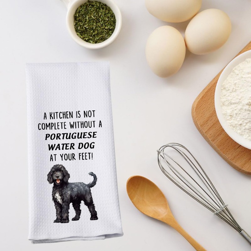 - Towel with saying:A KITCHEN IS NOT COMPLETE WITHOUT A PORTUGUESE WATER DOG AT YOUR FEET! This towel will make an excellent gift for a housewarming, wedding, hostess or holiday stocking stuffer as well as many other occasions.