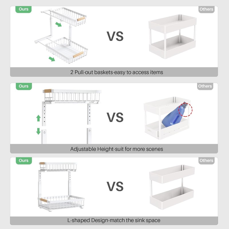 - 【Height Adjustable Design】The under sink organizer and storage upgraded version with 5 levels adjustable(from 13.6" to 16.9"), is ideal for various storage scenarios and fits your different sizes of cabinet. Helping you keep your items neatly organized under the sink