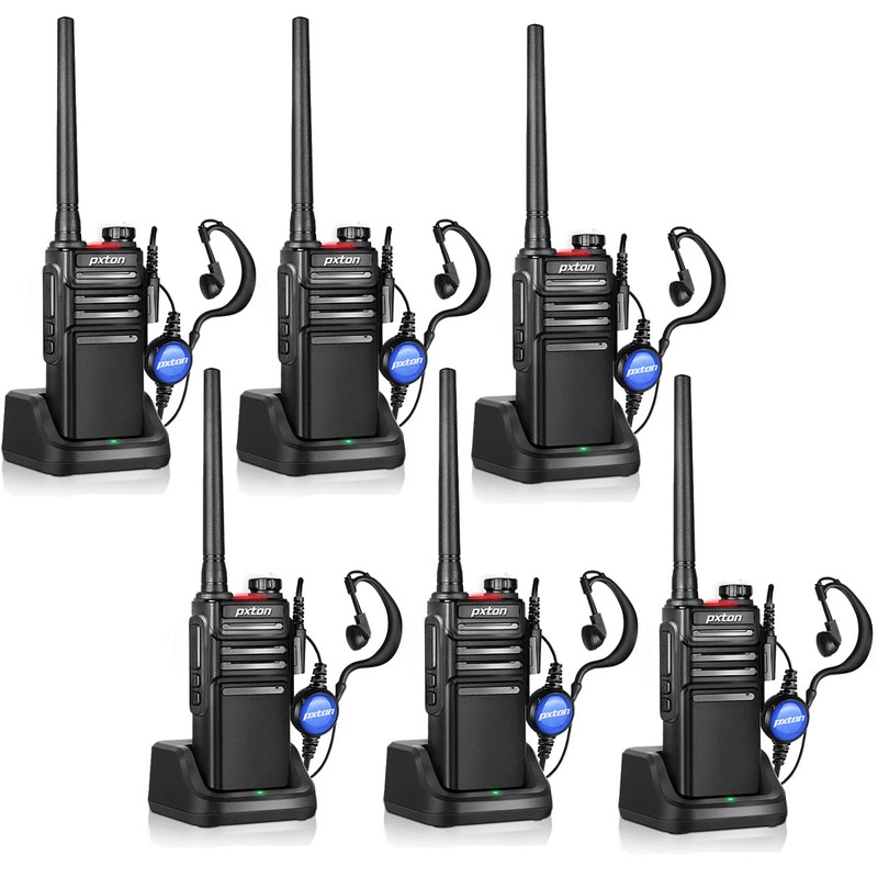 - Package contains: walkie talkies x 6, battery x 6, antenna x 6, belt clip x 6, lanyard x 6, headset x 6, Charging base x 6, user manual x 3. If you have any problems with pxton GMRS walkie talkies, please feel free to contact us through Amazon, our professional team will solve any problems for you.