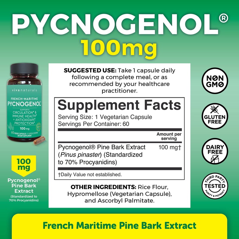 - ✔️ VEGETARIAN FRIENDLY, NON-GMO, GLUTEN FREE: Viva Naturals Pycnogenol is an ideal choice for vegetarians, and it's made without GMOs, gluten, and dairy. Made from a premium ingredient, this supplement undergoes third-party testing to ensure purity and potency.