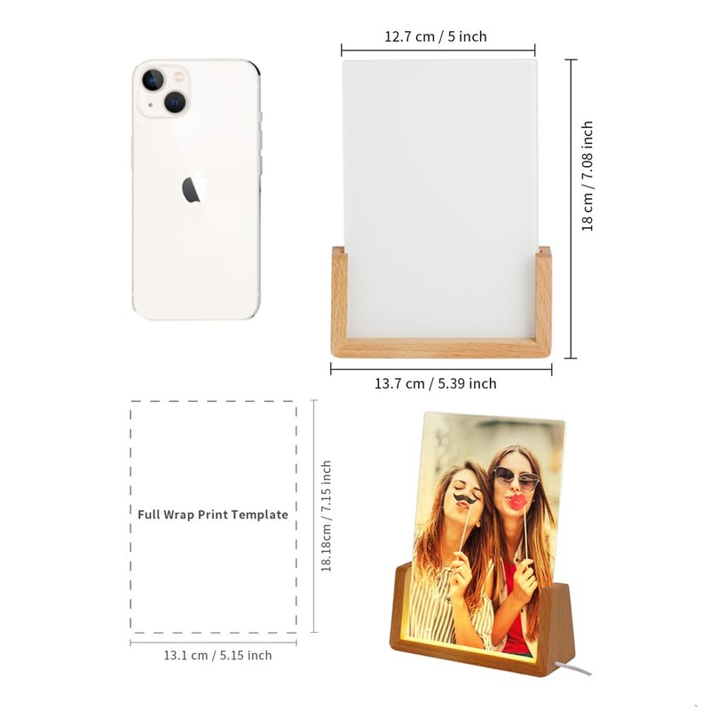 - Specification:The sublimation night lights blanks are 5" x 7" with wood stand,each led sublimation blanks glass photo frames panels with individual white box,8 pieces with brown box.The wood stand with USB interface,which can light up the photo frame with warm color light.