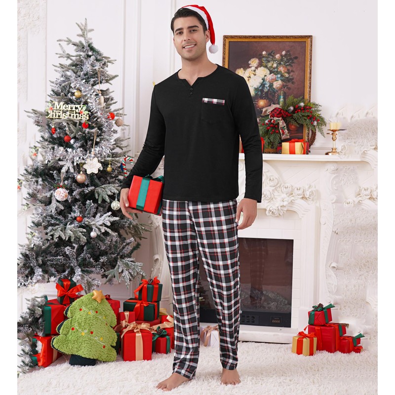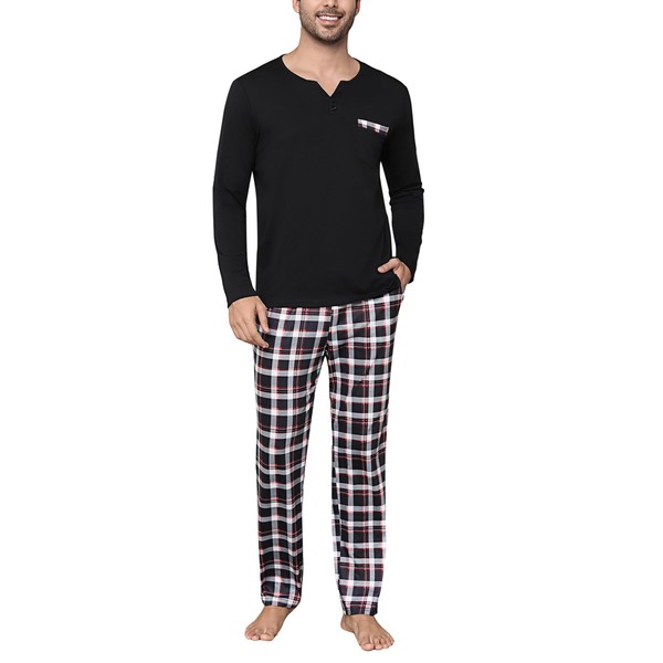 Pyjamas for Men | Soft & Cosy Mens Loungewear Sets | Warm Long Sleeve Pj's Set with Checked Pant | Comfortable Nightwear Black L