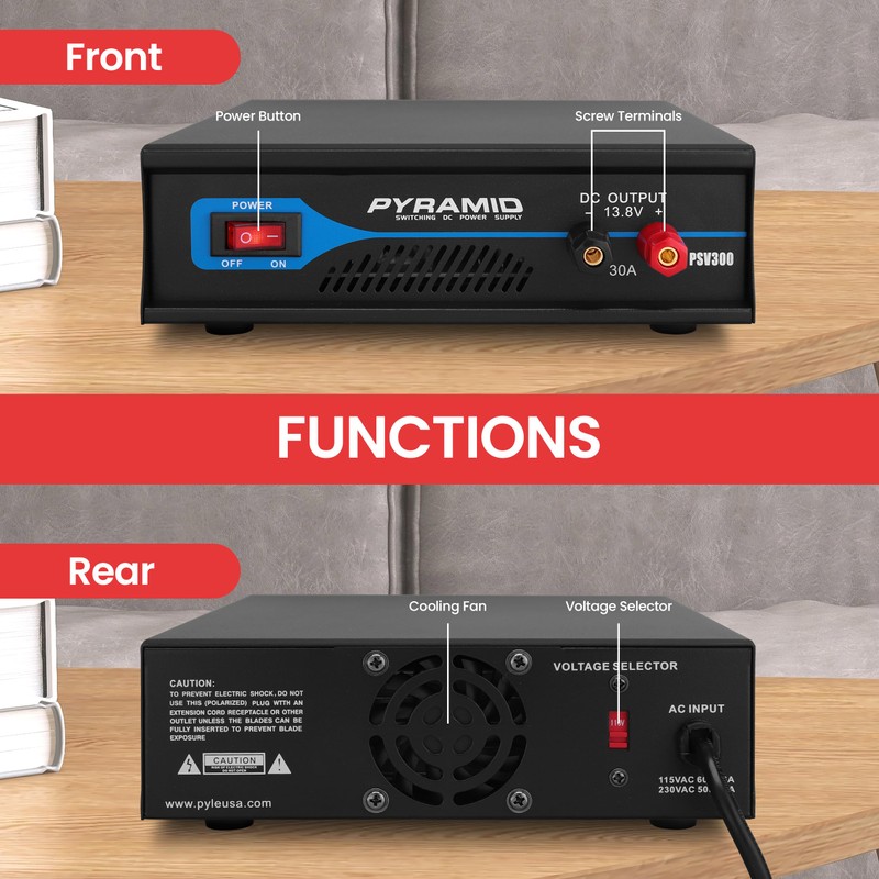 - BUILT-IN COOLING FAN: The power converter features a built-in cooling fan to prevent the device from overheating. Constant amperage is up to 30 AMP w/ power output of 13.8V DC and 115/230V AC switchable power supply