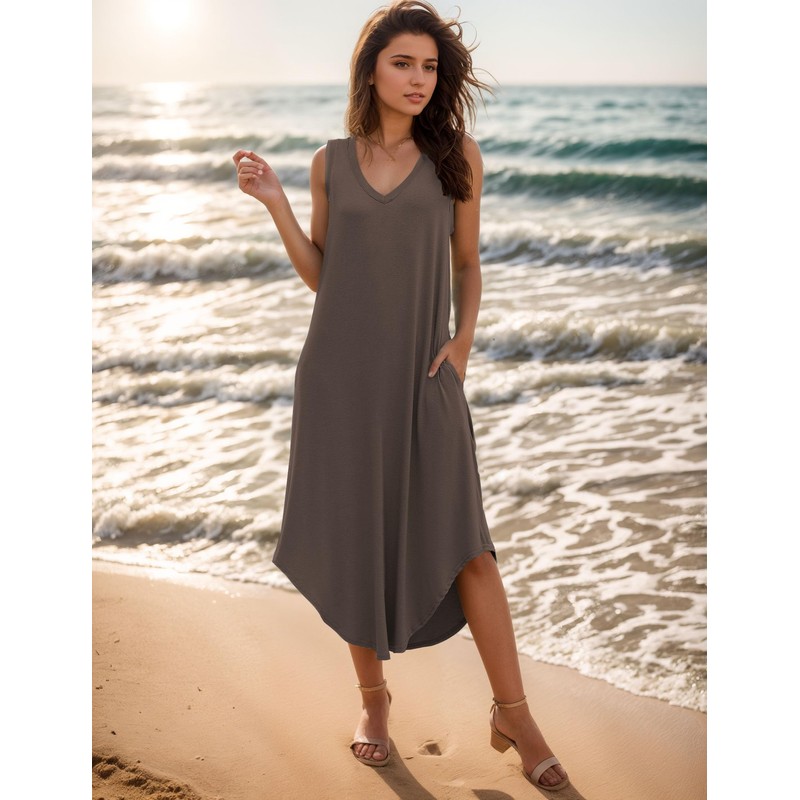 - DESIGN: Womens dresses features in v neck, Sleeveless design for more cool feeling, maxi dresses with pockets, loose midi dresses, the side split, over the knee length, casual beach dresses, swing flowy dresses, tank dress, sundresses for women. The simple summer dress design makes this maxi dress suitable for most lady’s body shape