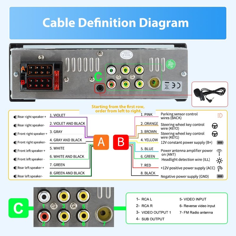 - Important Notes3.Ensure the red wire is connected to the ACC (car key fob) properly to make sure the single din car stereo turns off when the car is off, preventing it from staying on when the car is not running. 4.Make sure to insulate all wires correctly to prevent the positive and negative terminals from touching, avoiding short circuits or other safety hazards. 5.This single din car stereo works with 12-14.4V DC voltage, Max 15A. It can't be used for big trucks with 24V.