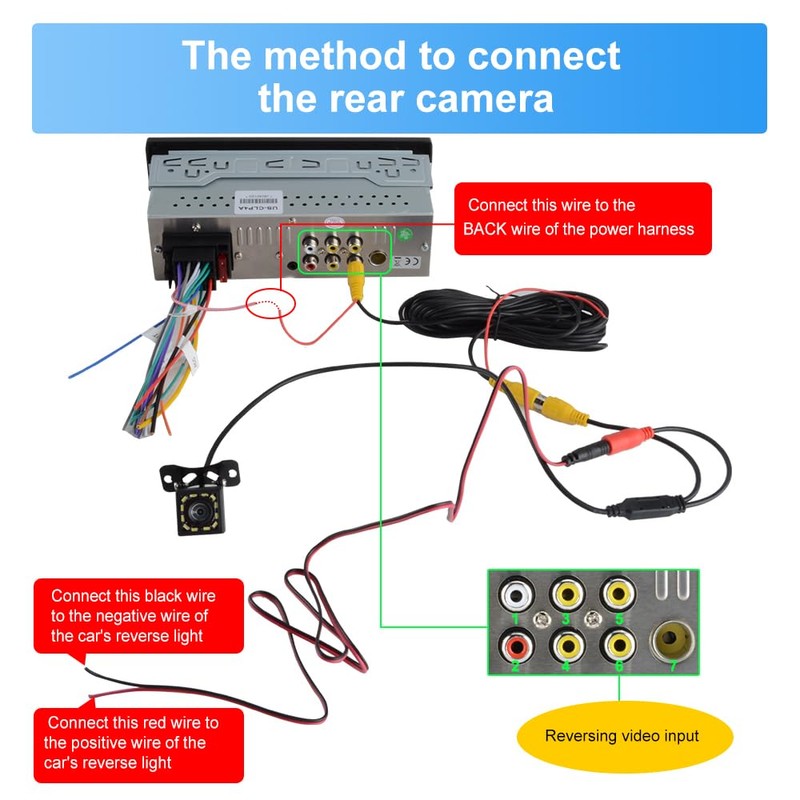 - Waterproof HD Backup Camera and RCA outputEnhance parking safety with a ultra-wide-angle, waterproof HD backup camera that delivers clear 1080P night vision, even in low-light or rainy conditions. The system automatically switches to the rear view when reversing, making parking easier and safer. Supports RCA output, ensuring seamless integration with your car stereo.