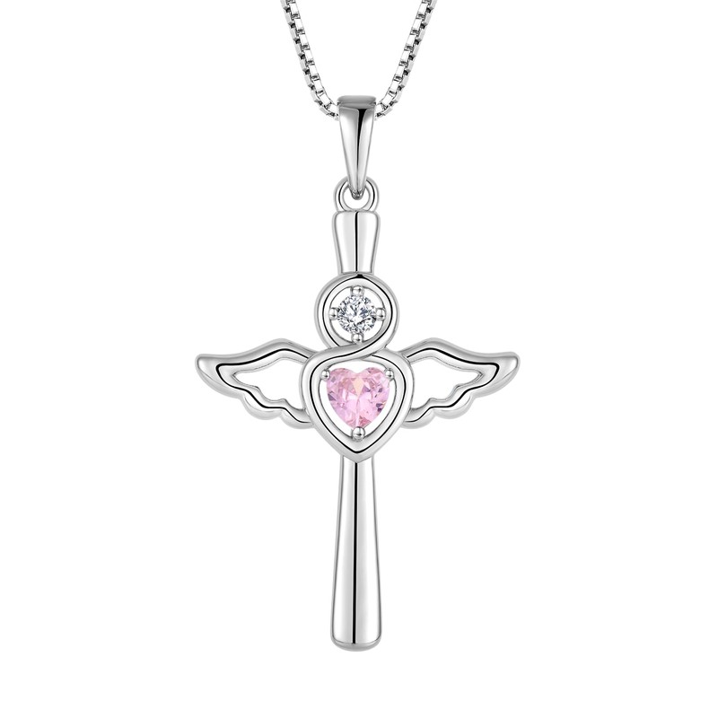 PYNZY Cross Necklaces for Women, 925 Sterling Silver Angel Wing Heart Created Pink Tourmaline Birthstone Pendants Christian Crucifix Baptism Jewelry