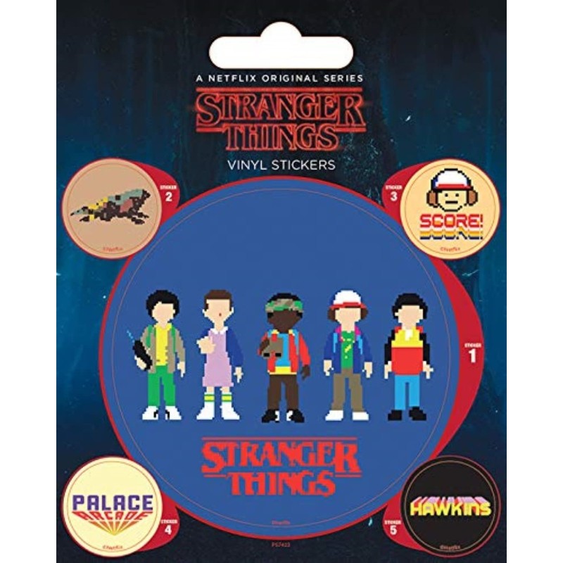 - LARGE 7cm (2.5") STICKER - shows video-game style images of Will, Mike, Dustin, Lucas and Eleven