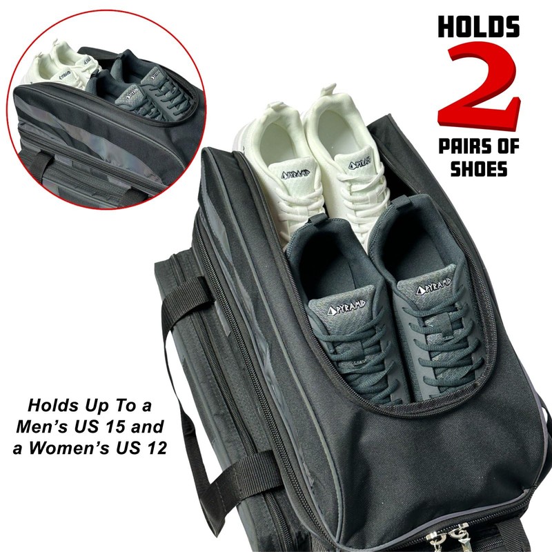 - Oversized Separate Shoe Compartment And “D” Ring - Includes a separate shoe storage compartment that stores and protects up to 2 pairs of bowling shoes (US Mens Size 15 and US Womens Size 12). Includes "D" Ring to easily attach small items to the outside, side portion of the bowling bag