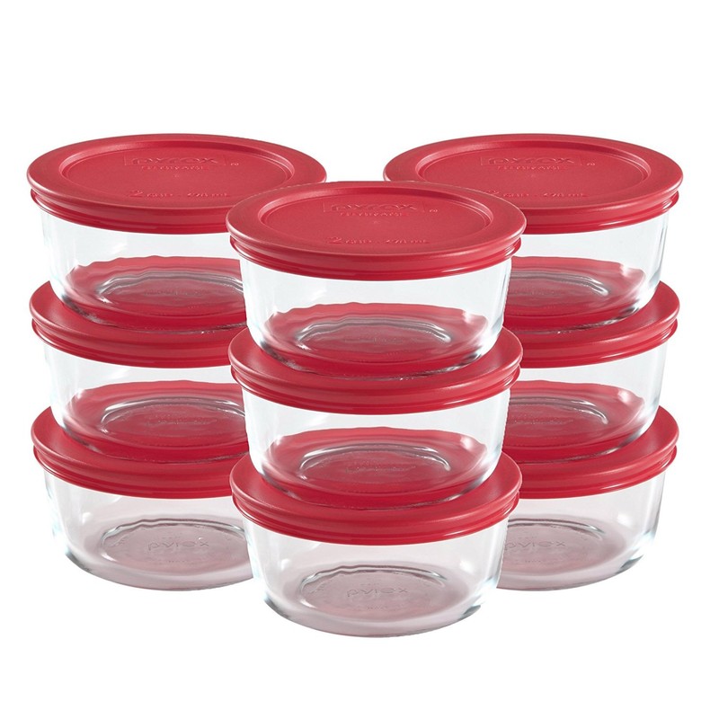 - 18-pc Storage Plus value pack includes 9 each: 2-cup round storage dishes with red plastic covers