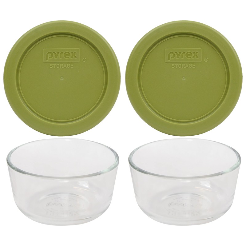 - Included: (2) Pyrex 7202 Glass Bowls & (2) Pyrex 7202-PC Olive Green Lids