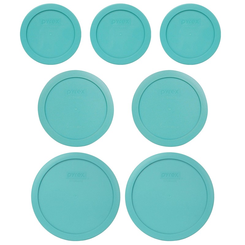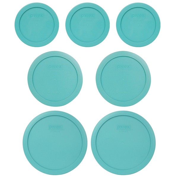 Pyrex (3) 7200-PC 2-Cup, (2) 7201-PC 4-Cip, & (2) 7402-PC 6/7-Cup Turquoise Round Plastic Food Storage Lids - Made in USA
