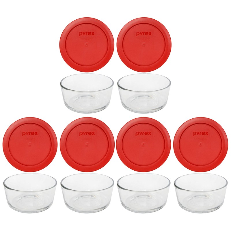 - Included: (6) Pyrex 7200 Glass Bowls & (6) Pyrex 7200-PC Poppy Red Lids