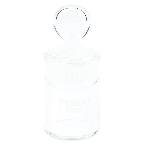 These 16mL PYREX® tall form weighing bottles have a 24/12 Standard Taper joint style opening that accepts a closed bottom, hollow pennyhead style stopper.
