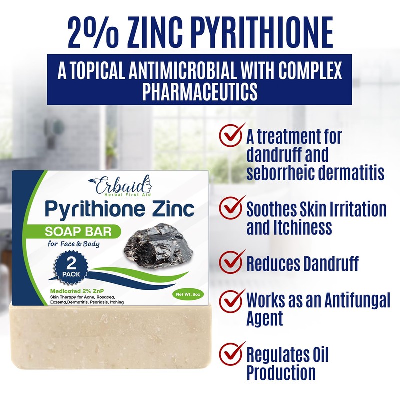 - 2% PYRITHIONE ZINC BAR SKIN SOAP: Found to possess healing and defense properties, zinc pyrithione is a synthesized medicinal grade ingredient proven to heal skin with its cleansing and soothing qualities.