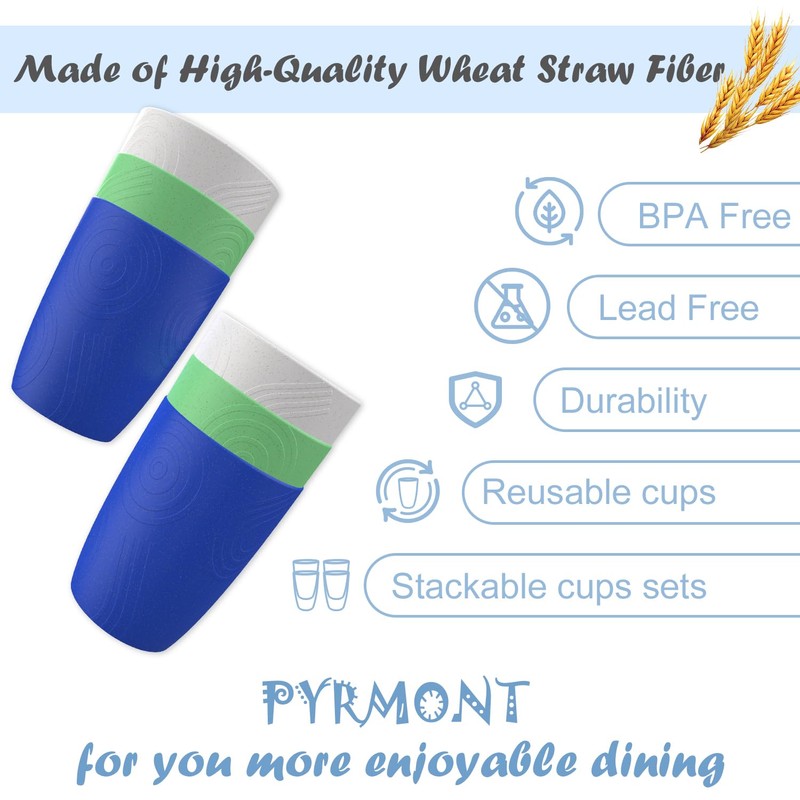PYRMONT Wheat Straw Cups,12oz Plastic Reusable cups,Kitchen Cups Set of 6,Dishwasher Safe Cups,Reusable Plastic Cups for Kids,Unbreakable and Reusable Picnic Cups (White, Green and Blue)