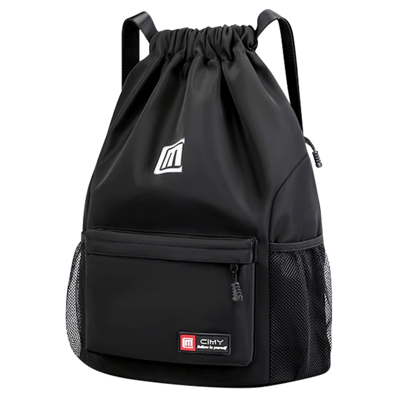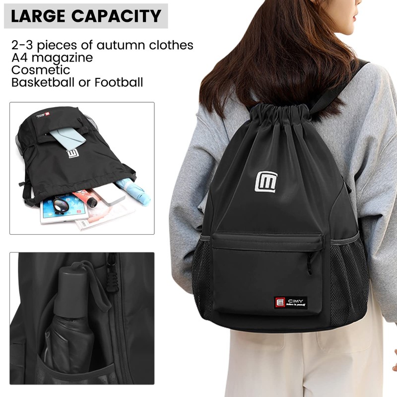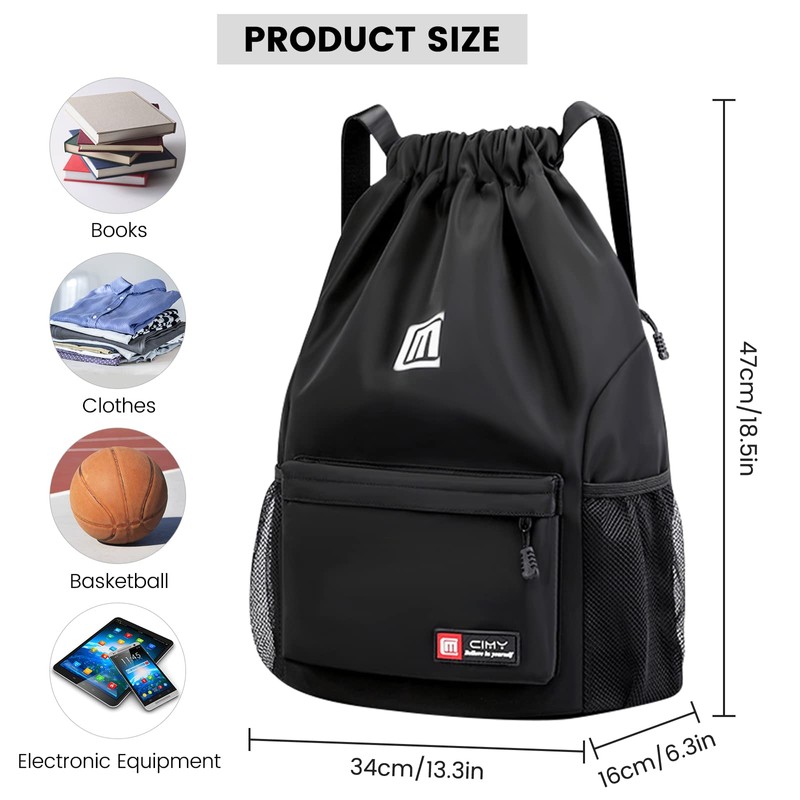 - Extra Large Capacity: The size of the drawstring gym bags is 47 x 34 cm (18.5 inches * 13.3 inches). It easily folds up to fit anywhere without adding any weight. Our drawstring bag that contains the main compartment with an interior security pocket and front and rear zip pockets. The main compartment can store books, clothes or other items, and it also has an exterior mesh pocket where you can put your water bottle.