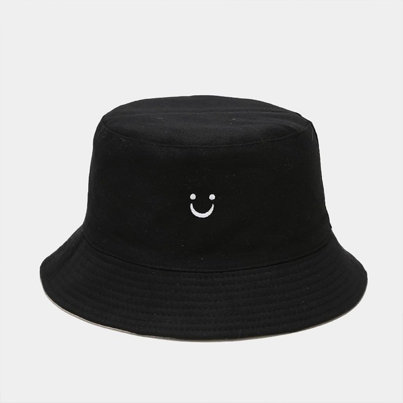 PythJooh 1PC Girls Boys Embroidered Smile Face Bucket Hat Kids Reversible Sun Hat Foldable Beach Hats Outdoor Caps for 2-8Years Black/Beige