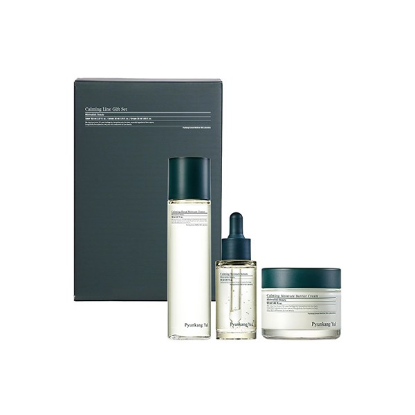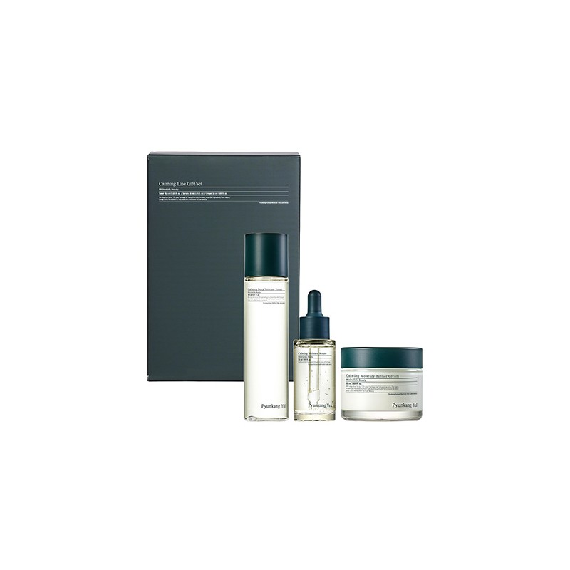 - The Pyunkang Yul Calming Line Gift Set, which includes a toner (150ml), serum (30ml), and calming moisture barrier cream (50ml), is designed to soothe skin, providing 24-hour hydration and firmness without clogging pores.