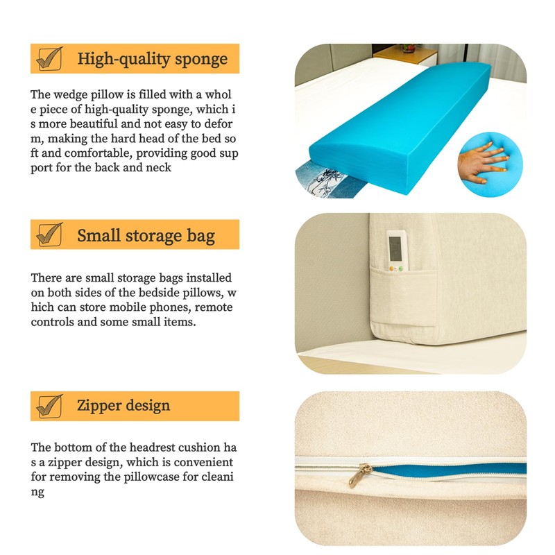 • 【Design】: The wedge headboard pillow adopts a wide bottom and narrow top arc design, which can provide excellent support no matter what posture you lean on it. Our wedge headboard pillow is designed with two capacity pockets on both sides, which can be used to place items such as mobile phones and remote controls.