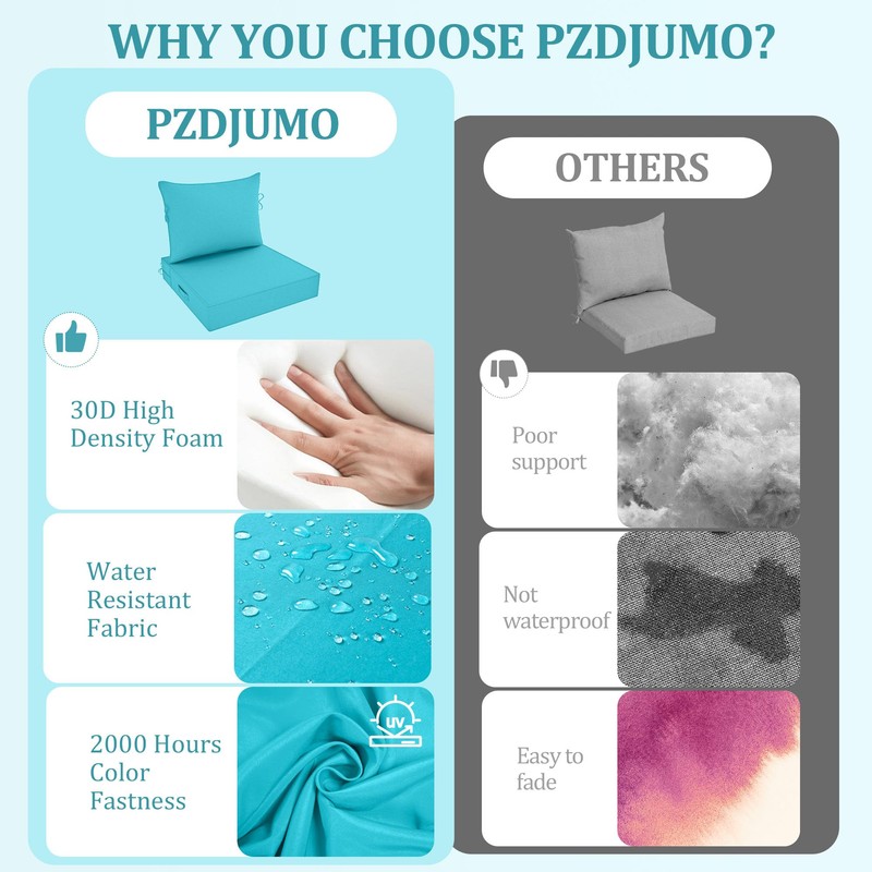 - Size of Deep Seat Cushions: The patio seat cushions set includes two bottom seat cushions (24” W x 24” D x 5” T) and two back cushions (24” W x 19” H x 7” T). The deep seat patio cushions are designed specifically to fit outdoor chair cushions like outdoor deep seat cushions or loveseat cushions for outdoor furniture. With dimensions that perfectly complement most outdoor patio furniture, but please ensure the best fit by measuring your furniture beforehand. ATTENTION: Please purchase genuine deep seat cushions from PZDJUMO store.