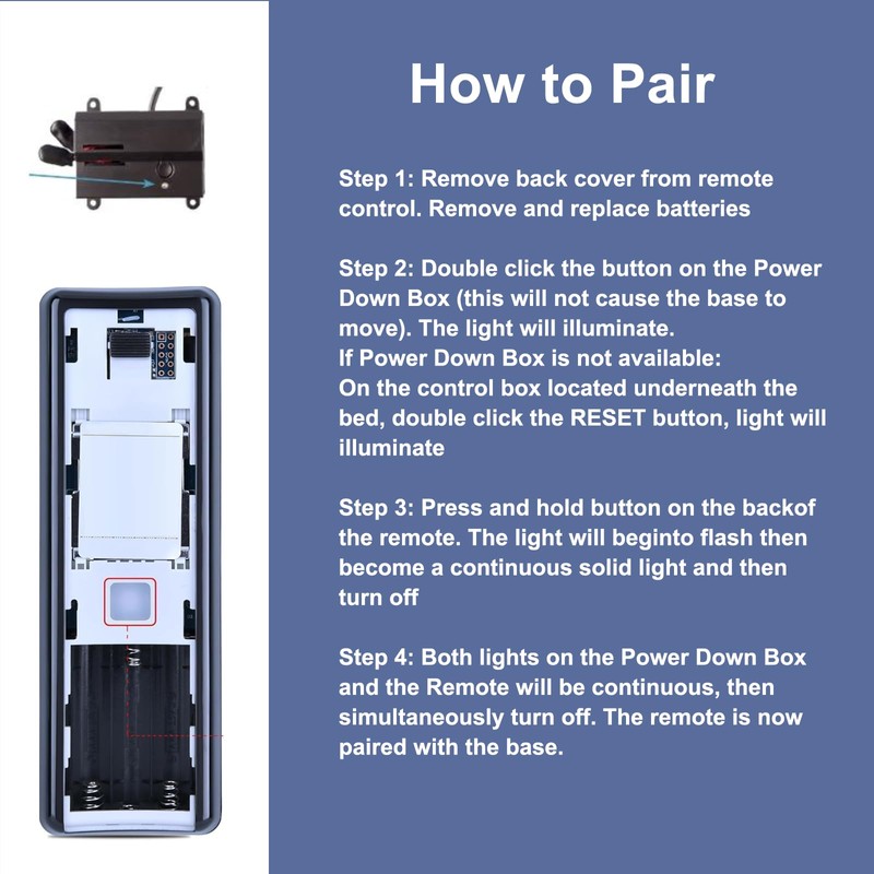 • Pairing Method: Please pair before use. 1) Remove back cover from remote control. Remove and replace batteries. 2) Double click the button on the Power Down Box. The light will illuminate. 3) Press and hold button on the backof the remote. The light will beginto flash then become a continuous solid light and then turn off. 4) Both lights on the Power Down Box and the Remote will be continuous, then simultaneously turn off.