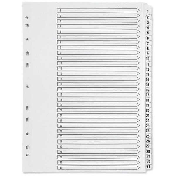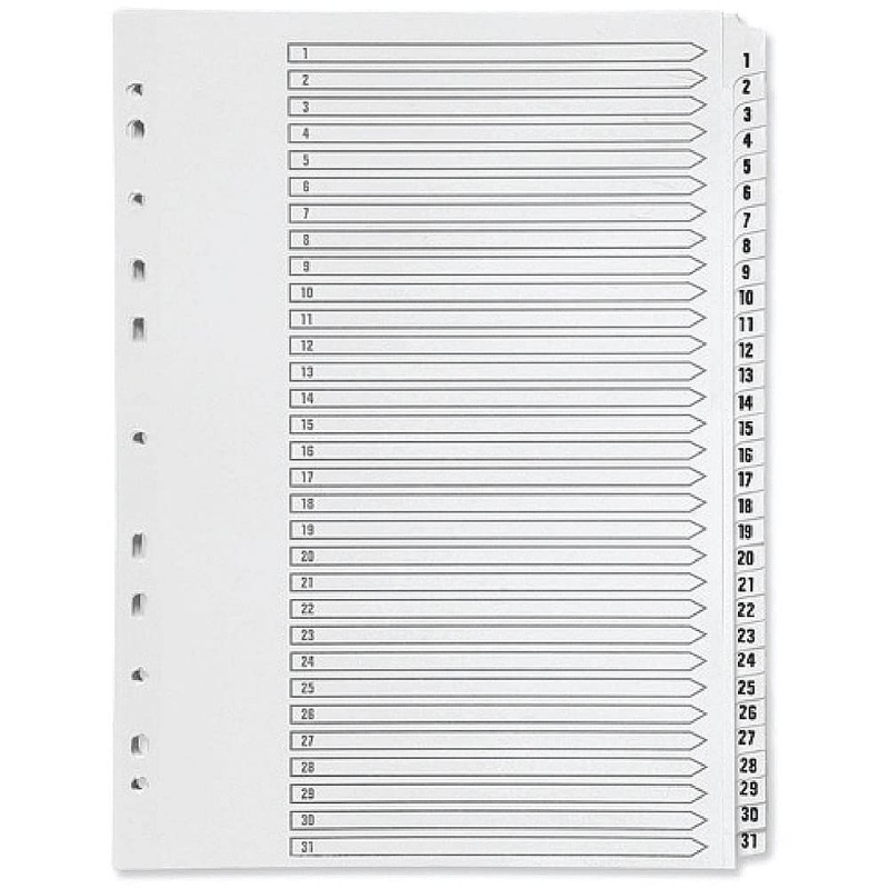 - Made of durable polypropylene, this Q-Connect Index is numbered 1-31 to help you organise your filing, a front index card allows you to label your notes for quick and easy referencing, Multi-punched to fit standard A4 ring binders and lever arch files, this 31-part index is pre-printed 1-31 and comes in a pack of 1
