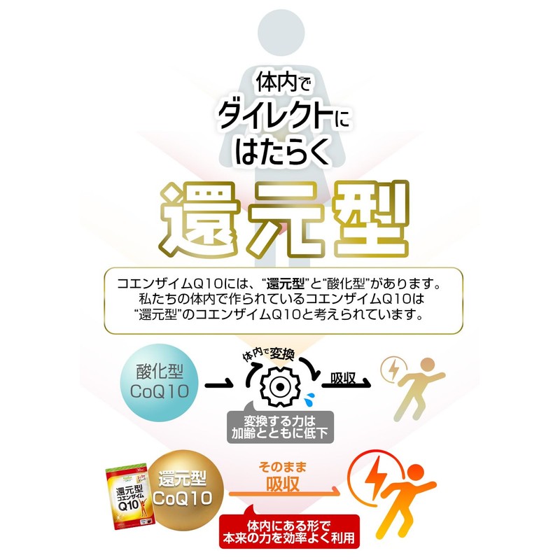・コエンザイムQ10には「酸化型」と「還元型」の2種類があります。体内で作られるコエンザイムQ10は還元型のため、酸化型のコエンザイムQ10を摂取した場合、体内で還元型に変換する必要があります。