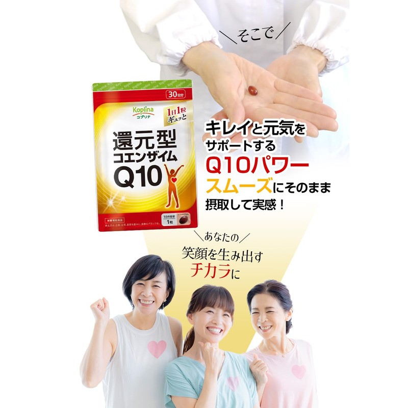 - ✅【還元型コエンザイムQ10 100mg 配合】1日1粒で、必要なエネルギーを産出するのに必要な量といわれています。体内ですぐに使える「還元型」コエンザイムQ10を使用