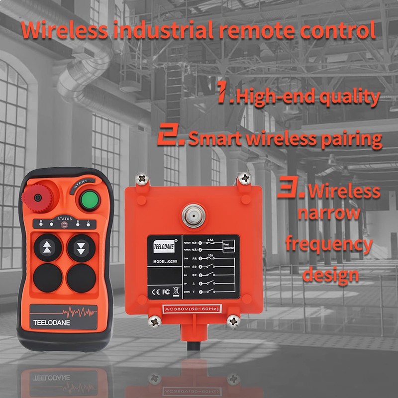 Q200 Industrial Wireless Crane Remote Control kit 2 Button 12v 24v Electric Lift Hoist Transmitter Receiver with Emergency Stop (AC/DC 12-24V 1T1R)